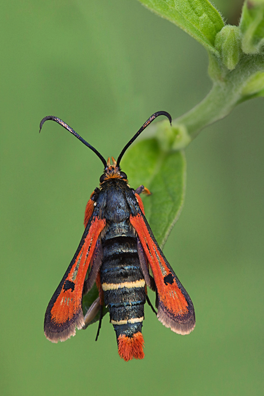 Female Firey Clearwing on caterpillar food plant while laying eggs (by simply dropping them onto the soil next to the plant).