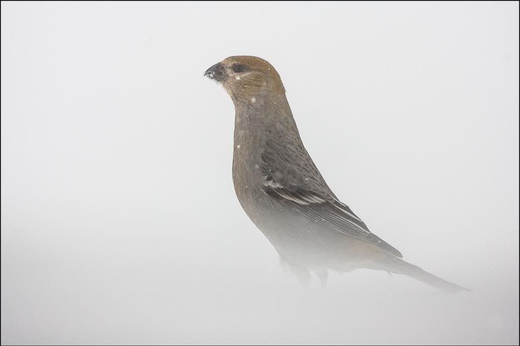Pine Grosbeak in a blizzard