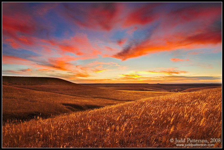 The red clouds here are really nice. I find I don't mind the hill on the left. There are a couple other dark spots (valleys I guess and the distant horizon to the right) that offset the dark hill for me and make it look like it needs to be there. The golden grass is really cool too. Well done indeed.