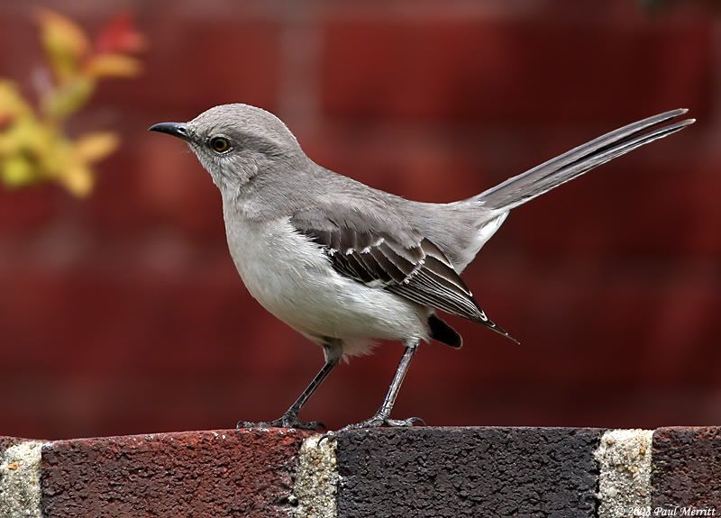 That brick wall really compliments the color and detail of the mocker. A very sharp image. A head turn sure would have been nice....but sometimes they just have a mind of their own. Perhaps you'll have more chances. I have a couple of mockers that come to my window at school as I feed them raisins. They appear as soon as the light goes on in the morning. If I get busy and don't feed them immediately they've been known to peck on the window to remind me.