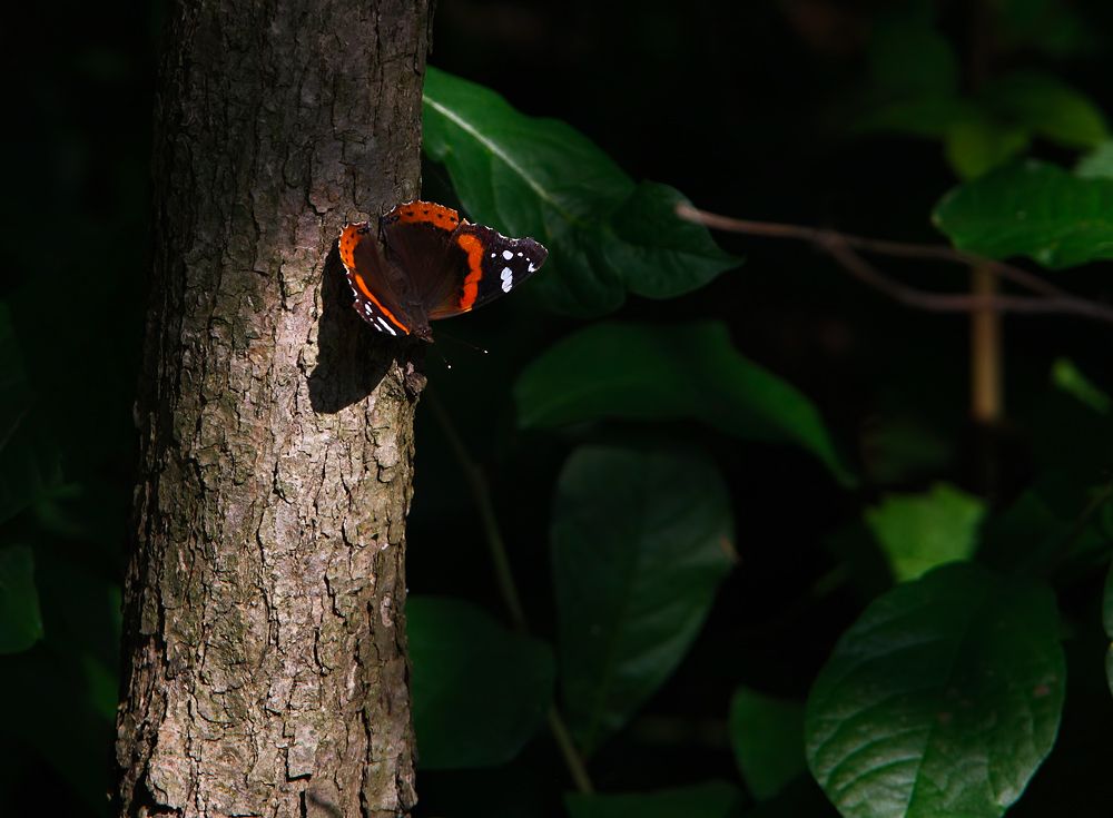 Not really a macro shot, so hope it still fits within the context of the forum. I liked how the light illuminated this Red Admiral Butterfly and how the dark greens and darkness of the forest contrasted his colors. His pose could have been a bit better, but he flew off right after this shot.