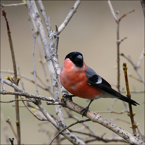 You mentioned in a previous post that you wished you got birds like the Scarlet Tanager in Sweden. Well I don't think you are doing too badly with the Bullfinch- a truly spectacular bird. I think some lightening of the image would benefit so long as you didn't reveal noise in the dark areas. You may find you have some detail in the black around the face, which would be nice to bring out, particularly around the eye. You may want to consider a crop giving more room on the right, in the direction of where the bird is looking.