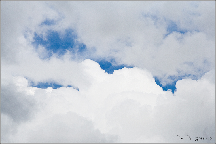 I agree that clouds are a very cool subjects and most of the time they can't stand on their own.......because they tend to lack a center of interest. Here I feel the composition works very well as anabstract or cloudscape.....as the grey top acts as a nice framing element and the depth of the FG clods really does work.......although i brought more detail out with a significant shadow/highlight........mostly highlight...adjustment.....and then added a bit of contrast. This really brought out the subtle tones of the dramtic clouds.