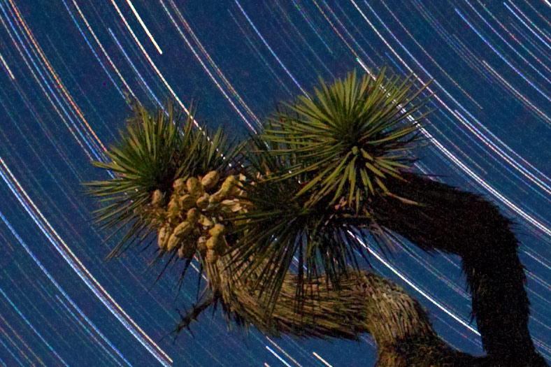 The North Star (Polaris) sitting steady above a Joshua Tree. The total exposure was approximately 75 minutes (1 minute exposures, stacked). I had to edit out about a dozen airplane trails. Even in a dark spot like this park, you can see the lights from the towns of Joshua Tree/Twenty Nine Palms. The Joshua Tree was lit by moonlight.