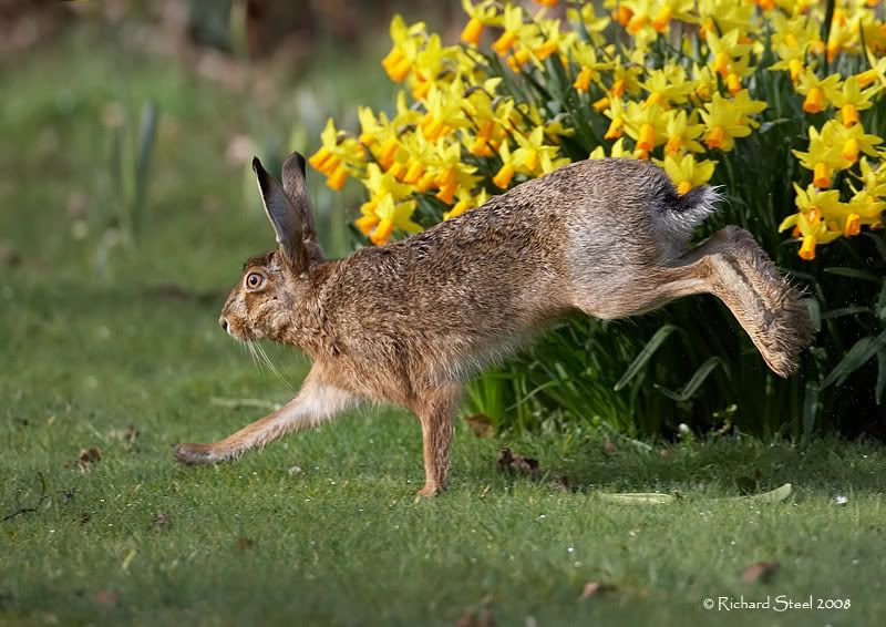 BBC Countryfile is an hour long well established TV show that is put out on a Sunday morning and covers issues around farming, the environment and wildlife. For the last three years they have held an annual photography compeition with the final short-list of 12 being published in a calender they sell to raise money for the childrens charity 'Children in Need'. This year I decided to enter as the theme was 'Animals in Action' and I have spent many hours over the last few months photographing brown hares. I thought I would enter some hare photos as they are not a commonly photographed animal due to their shyness but popular being shrouded in rural folklore (you can thank them for your Easter eggs!). They are also associated with farmland which I thought linked in well with the programme. I originally picked out four hare photos to enter including this one unusually running past a patch of daffodils which I thought had March stamped on it. As the saying goes 'mad as a march hare!'.