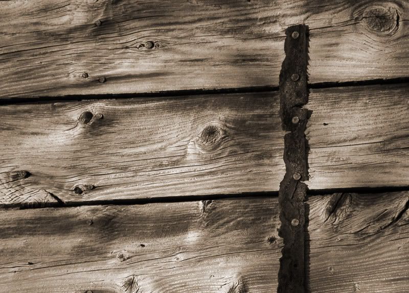 Christopher, This has a very natural feel to it. I like that the boards aren't straight-it gives them some perspective. The sepia tone is nice. The strapping (I'm guessing that's what it is) is placed well in the frame.Nicely done!