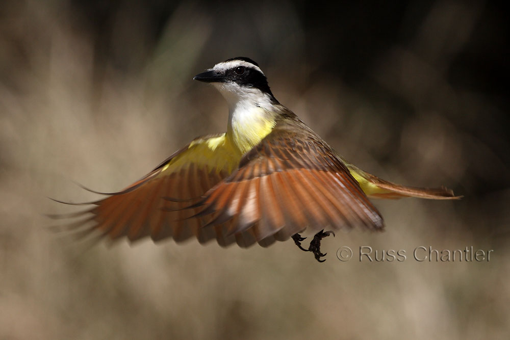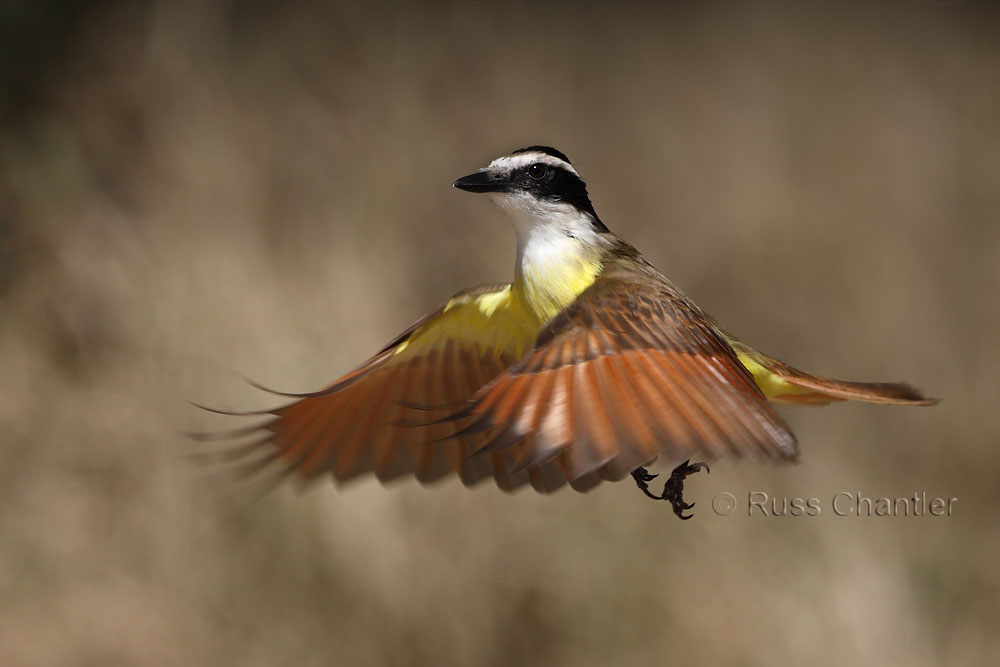 This Kiskadee is hovering at a log feeder filled with a peanut butter mix. Being flycatchers, they will often hover & then move in to steal a quick bite. Manually focued on the plane of the feeder & firing 5 frames a second without looking through the viewfinder. Deleted lots, and got a few. Was trying to get the grass as background, but couldn't get any higher.