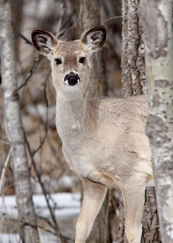 Not sure about the composition. I don't know if I needed the whole animal here. The back half in the bush and I could get a clear shot. Too much brush and trees. Not sure about the exposure as well. Does it seem light. I have a calibrated monitor and when I tried to darken it I started loosing detail in the ears and nose. It is spring and pretty drab. Also trying to make darker and/or saturate caused the fur to start looking unnatural.