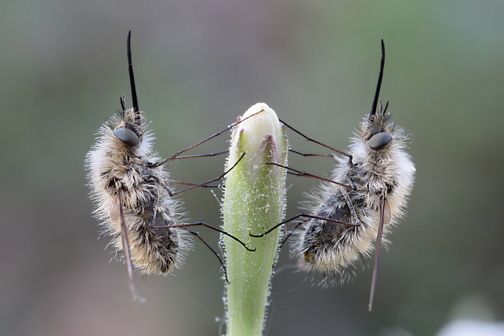Nice job capturing this quick guys! I agree with Steve that the LR white is distracting. I'd also consider cropping a little off the right only (keep the rest of the frame as is), to take away some of the balance in the frame. It would give a different mood, changing the feeling from a meeting or conversation of the flies to a tug of war for the stem.