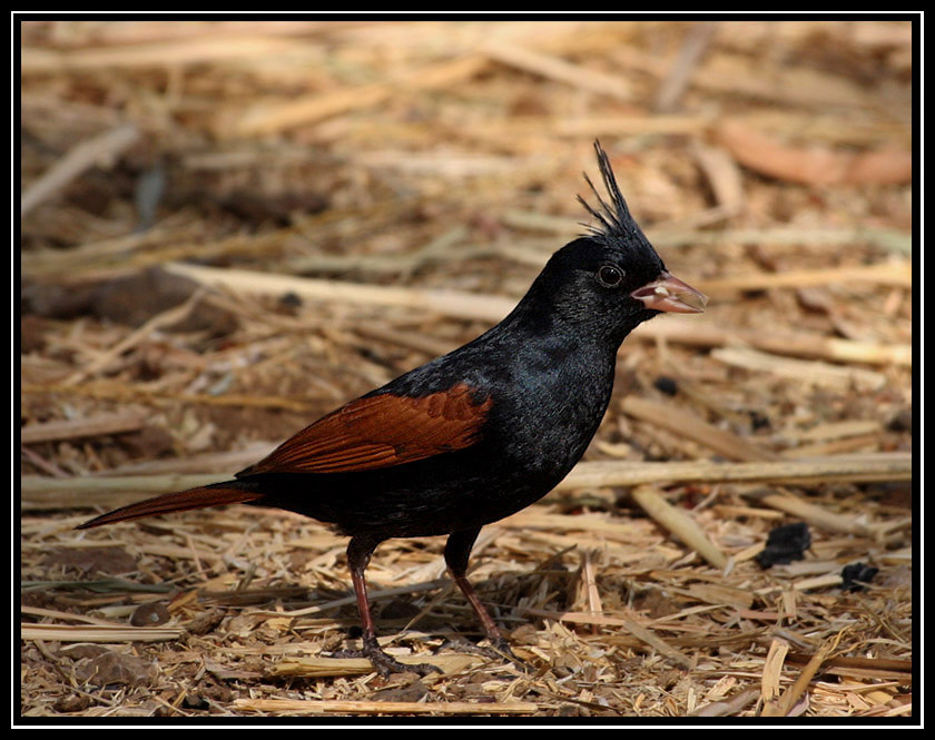 Very nice looking species, I love the rufous wings and tail on the black body. Very striking. The raised crest looks good too. You could lighten the iris a bit more if you wish. Excellent sharpness and alert pose!