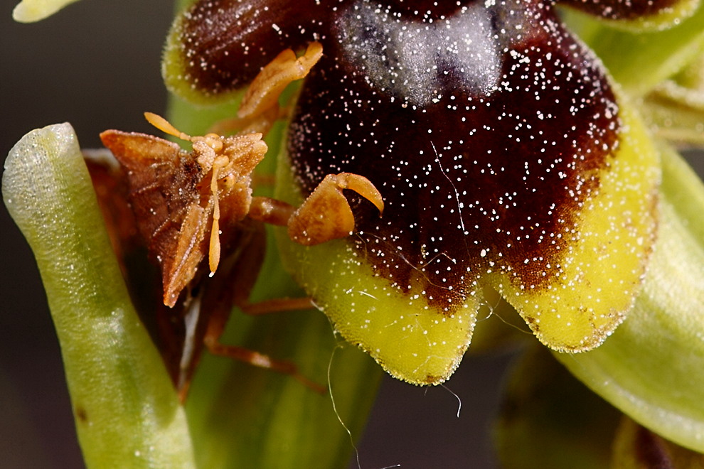 Phymata crassipes (ambush bug) on endemic orchid (Ophrys aymonii), road verge on Causse Noir between La Bourgarie and St. Pierre des Tripiers, Lozere, France.
