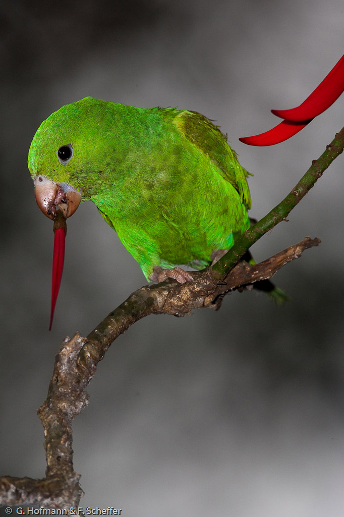Plain Parakeets are among the most common birds in the city of São Paulo, but they are still among my favorites. I like their behavior and their vibrant green. This bird was in the city-center feeding on nectar of flowers right after a heavy storm. As the background was an old ugly building I decided to take the grey and cloudy sky as background and underxpose it for 1.3 stops the bird got its light by flash. I wanted to create a black and white picture with a vibrant green parakeet. I am not happy with the red flower in the upper right corner but the bird never perched in a better position.