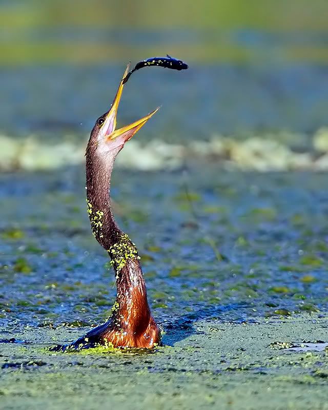 These guys like to toss their catch up in the air, so well timed whilst steering your boat Mike. Overall sharp, and I like the duckweed stuck on his neck. Great capture.