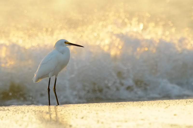 I do wish that the feet were visible but I was trying to get the crashing waves and sunset as background which meant i was flat on the higher sand while the egret was stood on the shoreline.