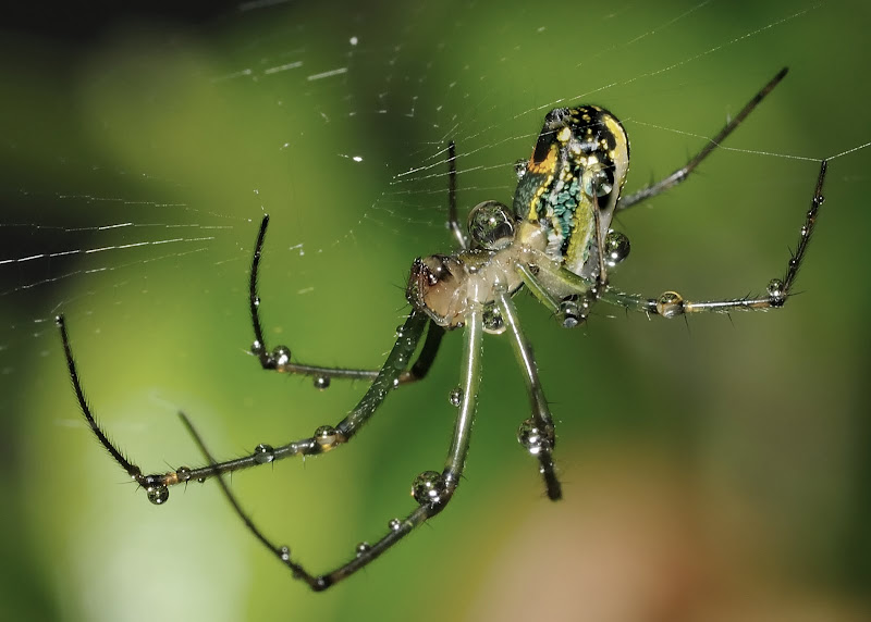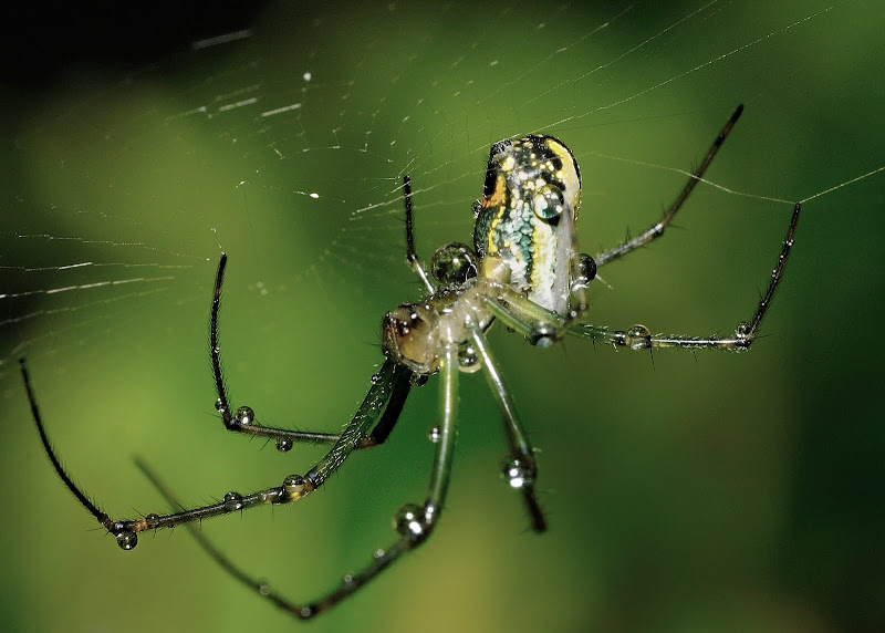 I am not usually a fan of spiders, but Daniel, you made this one look great and the image holds my interest with the colors on its body, even some of the hairs on its legs, and the sharp dew drops. How do you spot these guys that are so small?