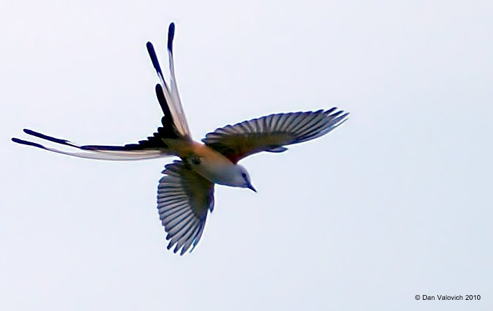 A beautiful view of the underneath and a nice wing spread. Looks like it might have been a large crop as there seems to be a loss of sharpness and detail. Given I'd love to see a Scissor Tailed Flycatcher I'd happy with it.