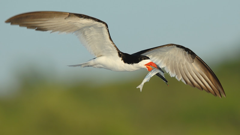I like the angle, soft light, sharpness and BG. The fish adds to it, I only find the bird too tight in the frame.