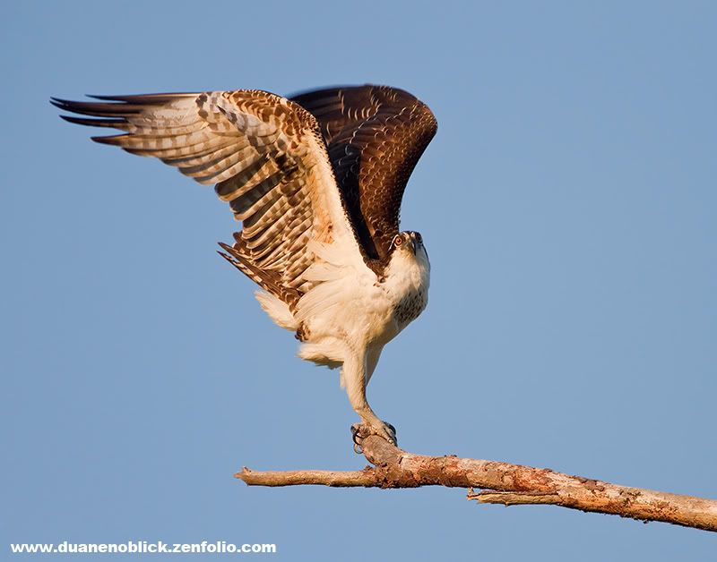 I was limited with my shooting angle (strip of land surrounded by water) so I took what the Osprey offered me...a total guess which way it was going to take off when another photographer approached. I'm not sure what you're refering to about the blue fringing...top of the far wing? If that's the case what you're calling fringing shows up in each image where I get wing blur as it starts or stops it's wing stroke. It happens in most of my in-flight Eagle images with low shutter speed and it's somehting I like to see in my images. Again, my preference.