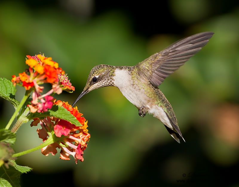 Amazingly sharp wings for a natural light image although there is something funky going on above the near wing--not sure if it is the far wing slightly blurred or ??? Wing position and EXP great. A bit contrasty and the light area behind the lower flower is a bit distracting.