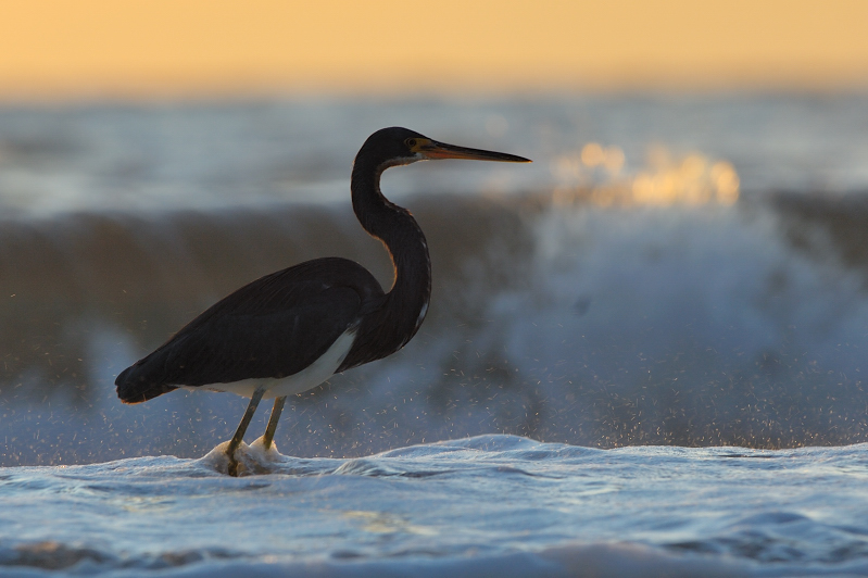 The water really tells a story here. It's rising up around the bird's legs, there's a wave crashing down in the BG, and there a bunch of small droplets catching what's left of the sun. I like that you got the bird's head above the breaking wave. I think I would apply a bit of CW rotation to level out the horizon.