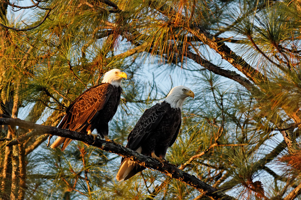 Finally got within 100 yards of some bald eagles that weren't hiding behind branches...the exposure was challenging with one bird in the sun and the other in the shade and they didn't hang around long to let me play with different settings. This shot is the best compromise on poses & exposure. It's cropped slightly, but I'm not sure if this is the final composure.