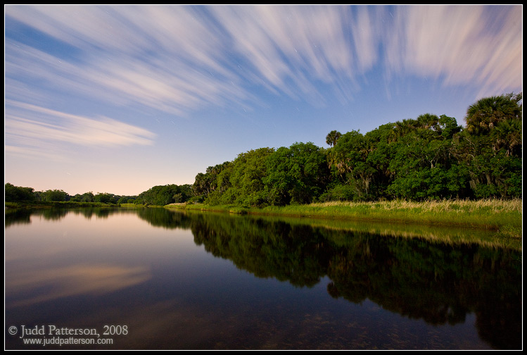 Nice flow to the clouds Judd. I think that the reflection helps to offset the lack of an anchor and I am OK with it as presented. You would not even know that it was a nighttime image. I like the angle the opposing shores make and how one is much longer then the other. It leads you through the image. Excellent execution.