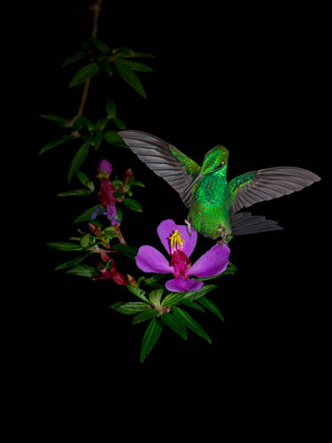 The male Green Crowned Brilliant (Heliodoxa jocular) displays a jewel like green iridescence over most of his body. It has a small violet patch on his throat, and a large, deeply forked blue-black tail. This hummingbird is a very fast flyer, allowing the sun's rays to be briefly reflected as he dances through the forest. It breeds in the highlands and then migrates to the lowlands of the Caribbean slopes. It feeds on Heliconia and other large flowers and, unlike other hummingbirds, often perches to feed.
