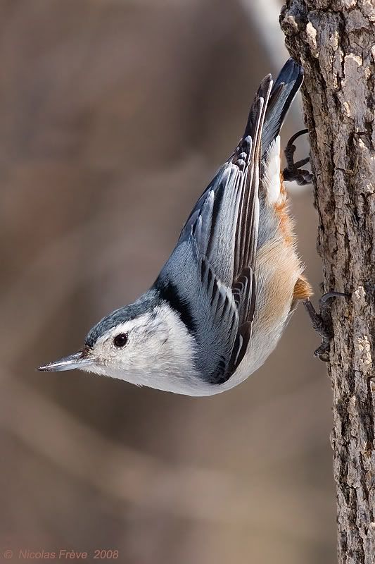 Welcome aboard! NIce pose on the little guy. I find just a touch too much space below and the white parts near the foot and at the top of the tree are quite distracting.
